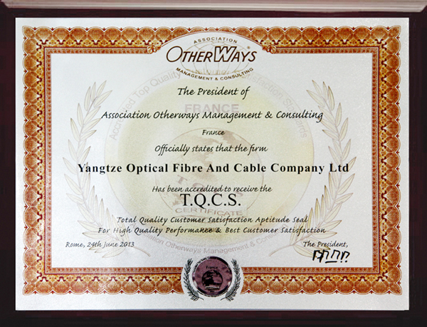 Yangtze Optical Fibre and Cable Company Ltd. (YOFC) has proudly awarded The Total Quality Customer Satisfaction Aptitude Seal For High Quality Performance & Best Customer Satisfaction (T.Q.C.S) and The Golden Award For Quality And Business Prestige from Association Otherways Management & Consulting, France.Followed with B.I.D International Quality Award in the Platinum Category, this is other international authoritative honor that YOFC received this year, which has fully recognized its excellence in quality culture and quality reputation in the industry.
