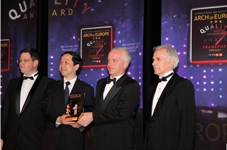 On April 27th to 28th 2013, the First Deputy CEO of Yangtze Optical Fibre and Cable Co., Ltd, Mr. Roger Preston, and the manager of Quality Assurance department, Mr. Niu Guohui attended the B.I.D International Arch of Europe Convention-Frankfurt 2013, and received “IAE International Arch of Europe Quality Award in the Platinum Category”. The Convention was organized by Business Initiative Directions (B.I.D).